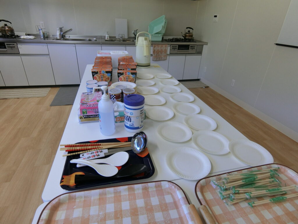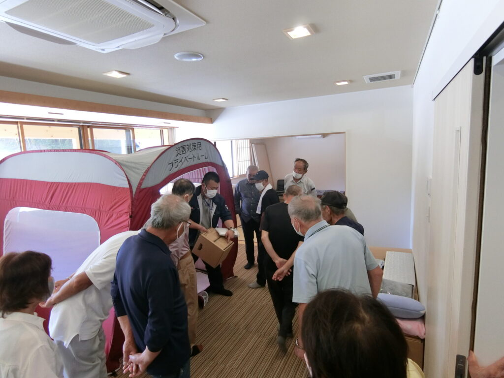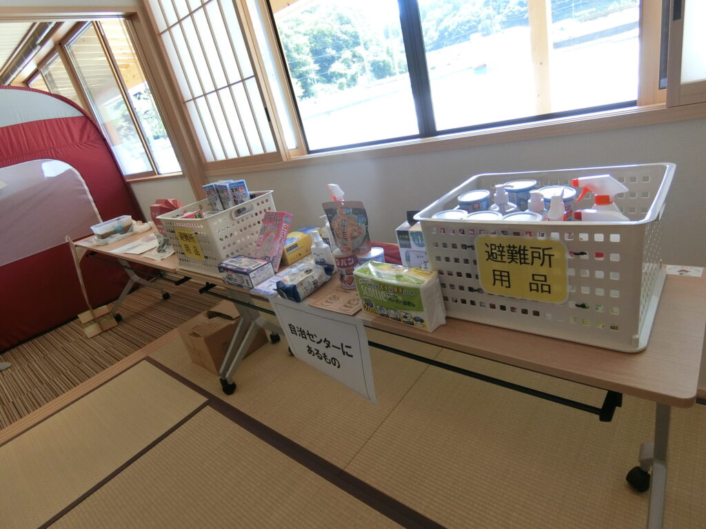 避難用品を展示。この避難用品は自治センター倉庫1に保管してあります。