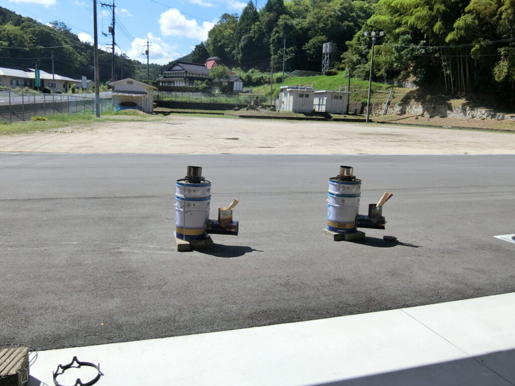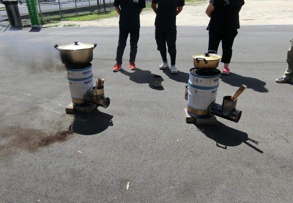 ロケットストーブの実演。結構な火力で早くお湯ができあがり、アルファ化米を調理しました。